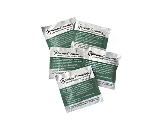 Дезинфицирующие салфетки «Алмадез-ликвид» представляют собой готовые к применению салфетки из белого нетканого материала различных размеров и разной плотности, равномерно пропитанные дезинфицирующим средством «Алмадез-ликвид».