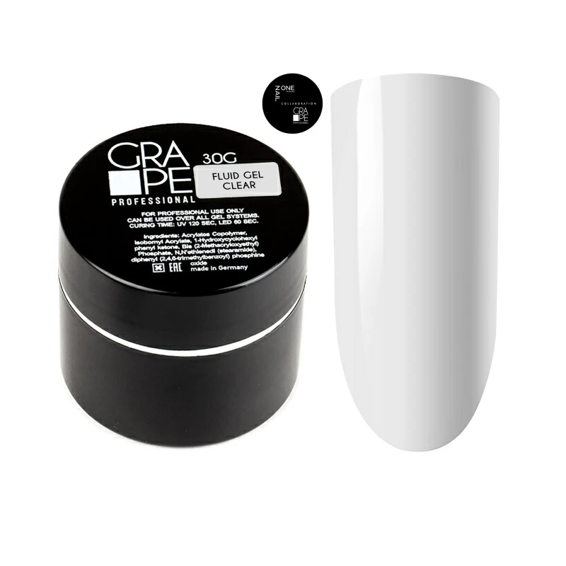 Collaboration (Коллаборация) OneNail Grape Professional Fluid gel. Объединенная коллекция холодных жидких гелей. Гель консистенции rubber/safe. Не вызывает жжение в лампе. Жесткий, крепкий гель для ногтей. Не густой, быстро самовыравнивается. Сохнет во всех лампах. Не кислотный холодный гель. Гель не желтит. За счет своей консистенции, не создает лишнего объема. Подходит гель для укрепления ногтей. Гель представлен в 23 оттенках. Коллекция состоит из камуфлирующих полупрозрачных и плотных оттенков. Способ применения:-предварительно подготовить ногтевую пластину, зашлифовать ногтевую поверхность, обезжирить-нанести базовое покрытие ONENAIL RUBBER или Grape Safe в тонкий слой и просушить 60сек-нанести выбранный оттенок геля-распределить по поверхности ногтя-просушить в лампе 60сек-при необходимости (если ногти скручиваются или тонкие) выпилить свободный край фрезой. CCFL LED-60сек. UV-90 сек.
